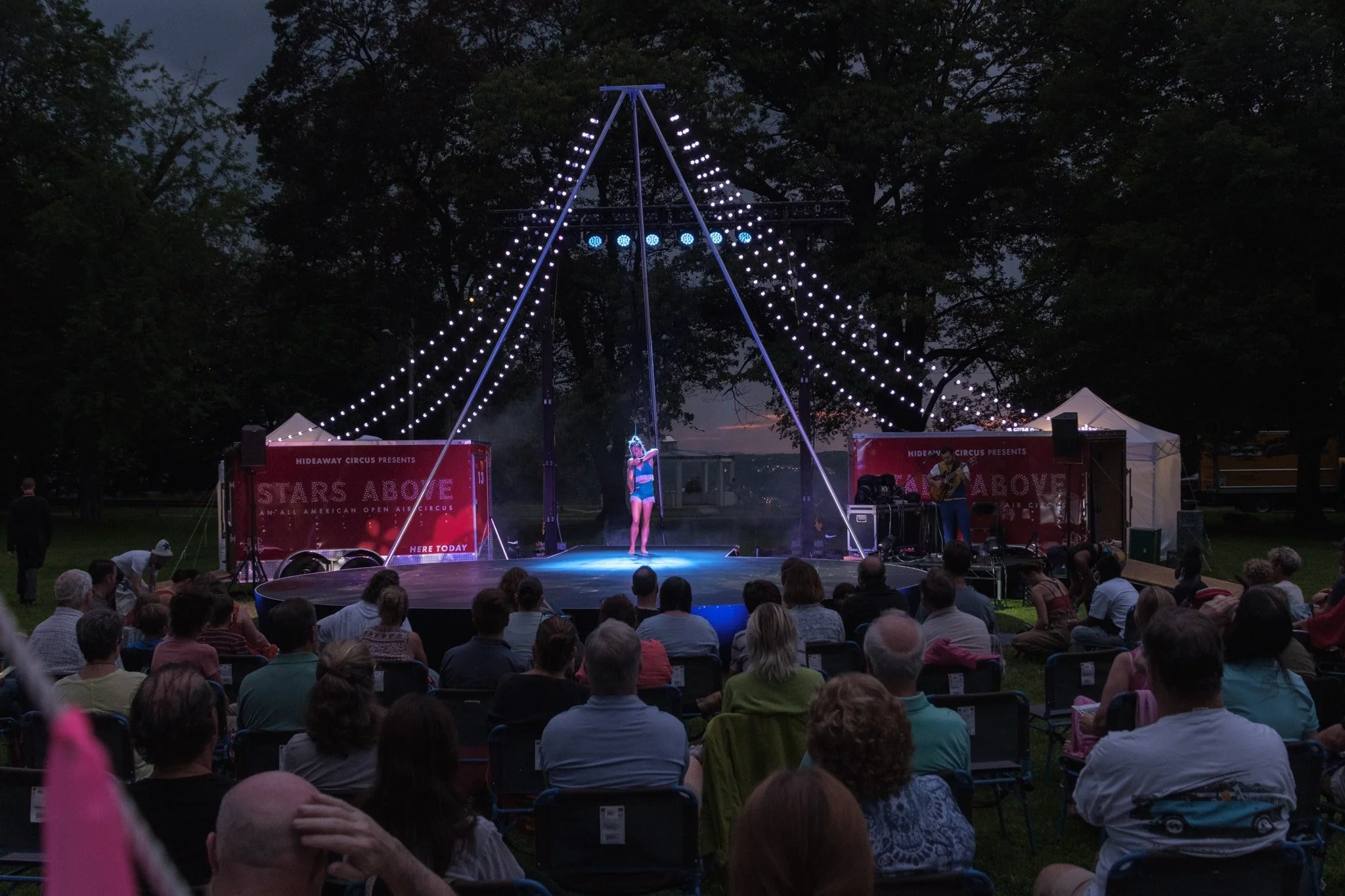 Scene from "Circus in the Park: The Stars Above” performed Aug. 19, 2021 in Troy's Prospect Park by Hideaway Circus, presented by CCIAC and Friends of Prospect Park. This year's events will be held underneath a "big top" circus tent. (provided).